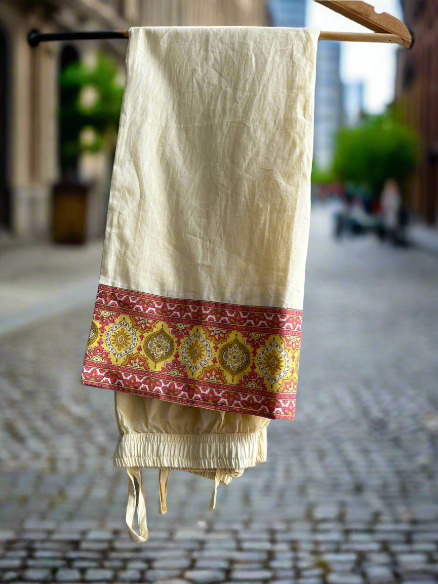 The set includes a matching printed dupatta with bordered edges and a comfortable solid cotton pant