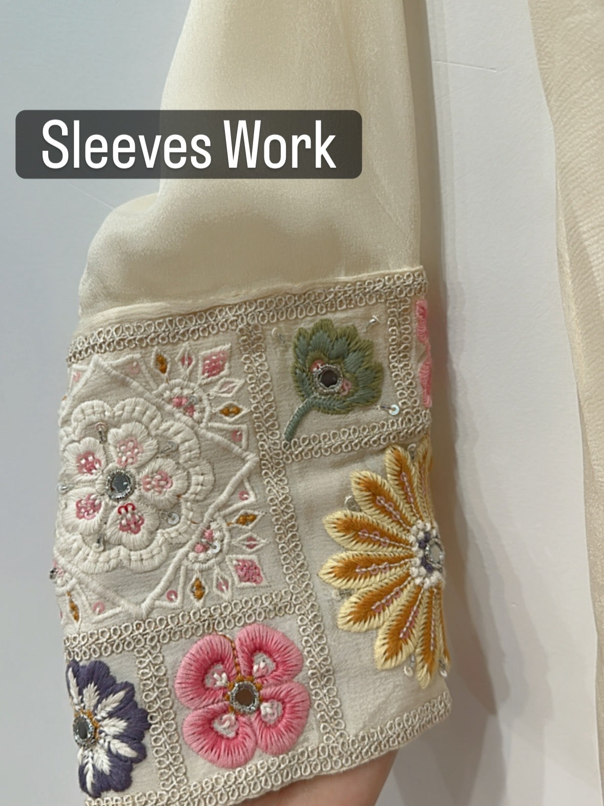 Elevate your style with this cream Chinon co-ord set, loved for its soft texture, subtle sheen, and graceful fall. The shirt is embellished with multicolour floral embroidery on the collar, cuffs, and front panel, enhanced by delicate mirror accents. The matching bottoms feature coordinated floral embroidery and intricate eyelet cutwork, giving a light and airy charm to the look.