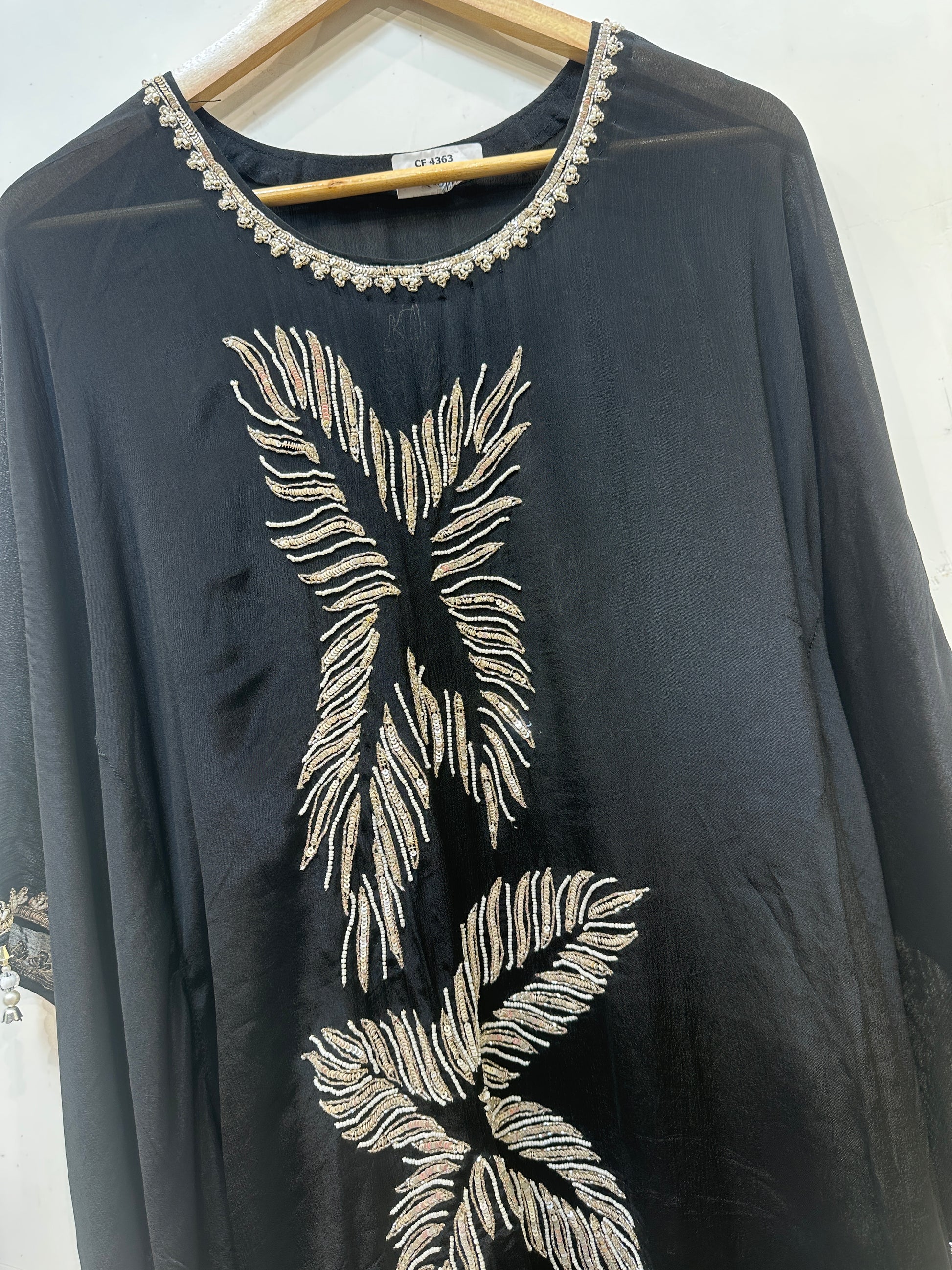 Turn heads with this elegant black kaftan set, beautifully adorned with intricate silver feather embroidery both on the front and back. Crafted in a lightweight, flowy fabric, this ensemble offers both comfort and sophistication — perfect for festive gatherings, family functions, or evening get-togethers. The kaftan sleeves are enhanced with delicate lace detailing for a touch of glamour.