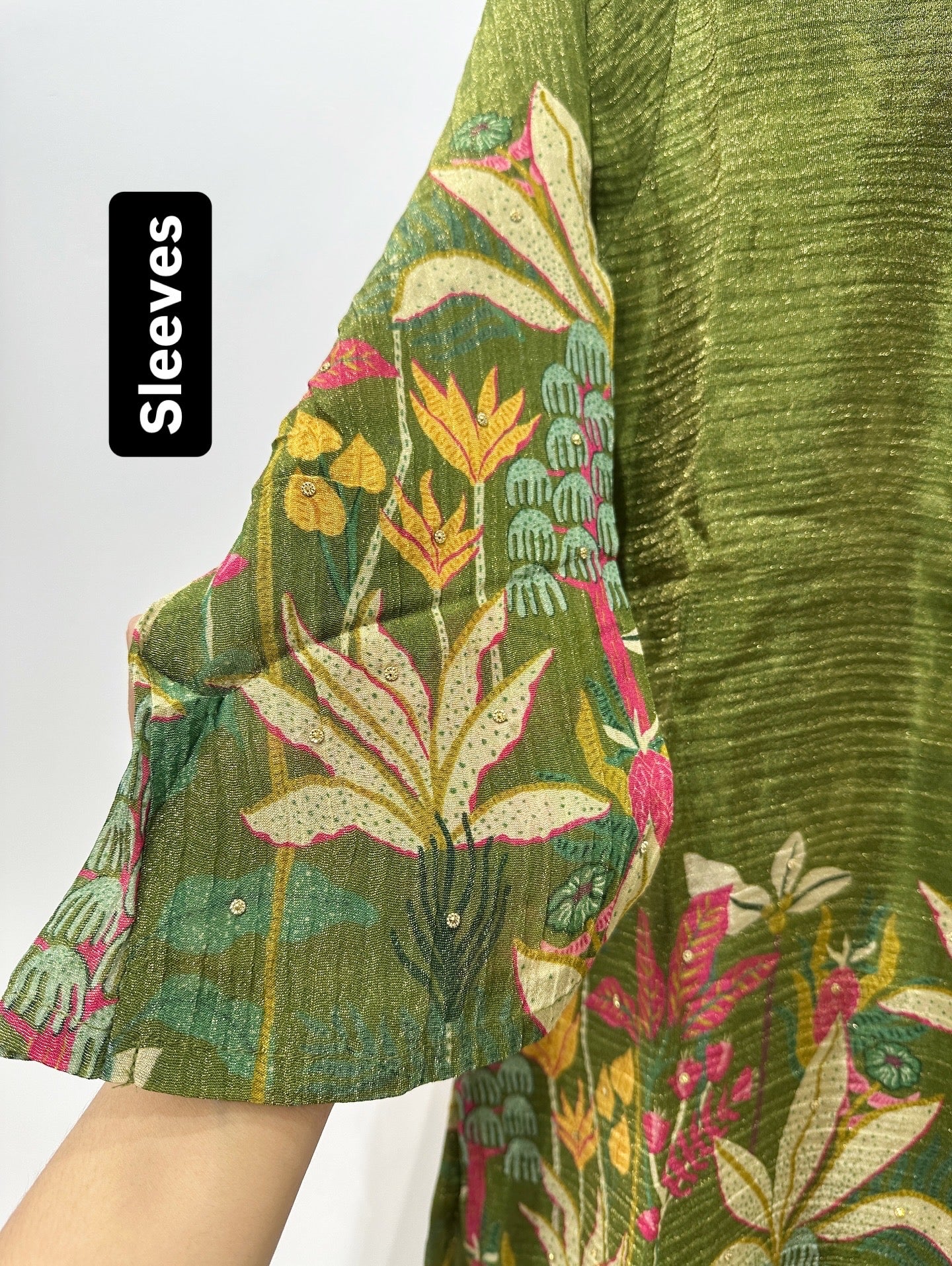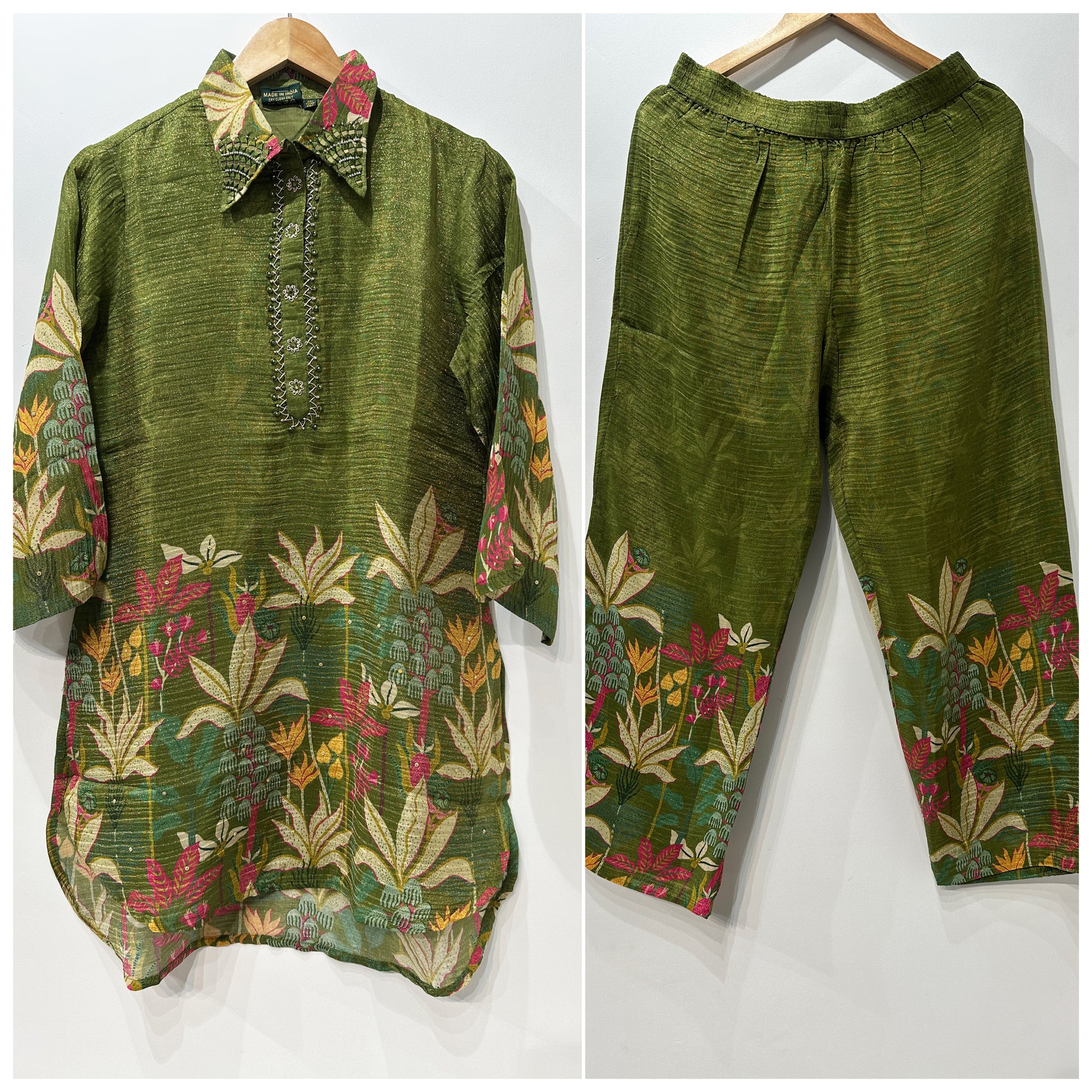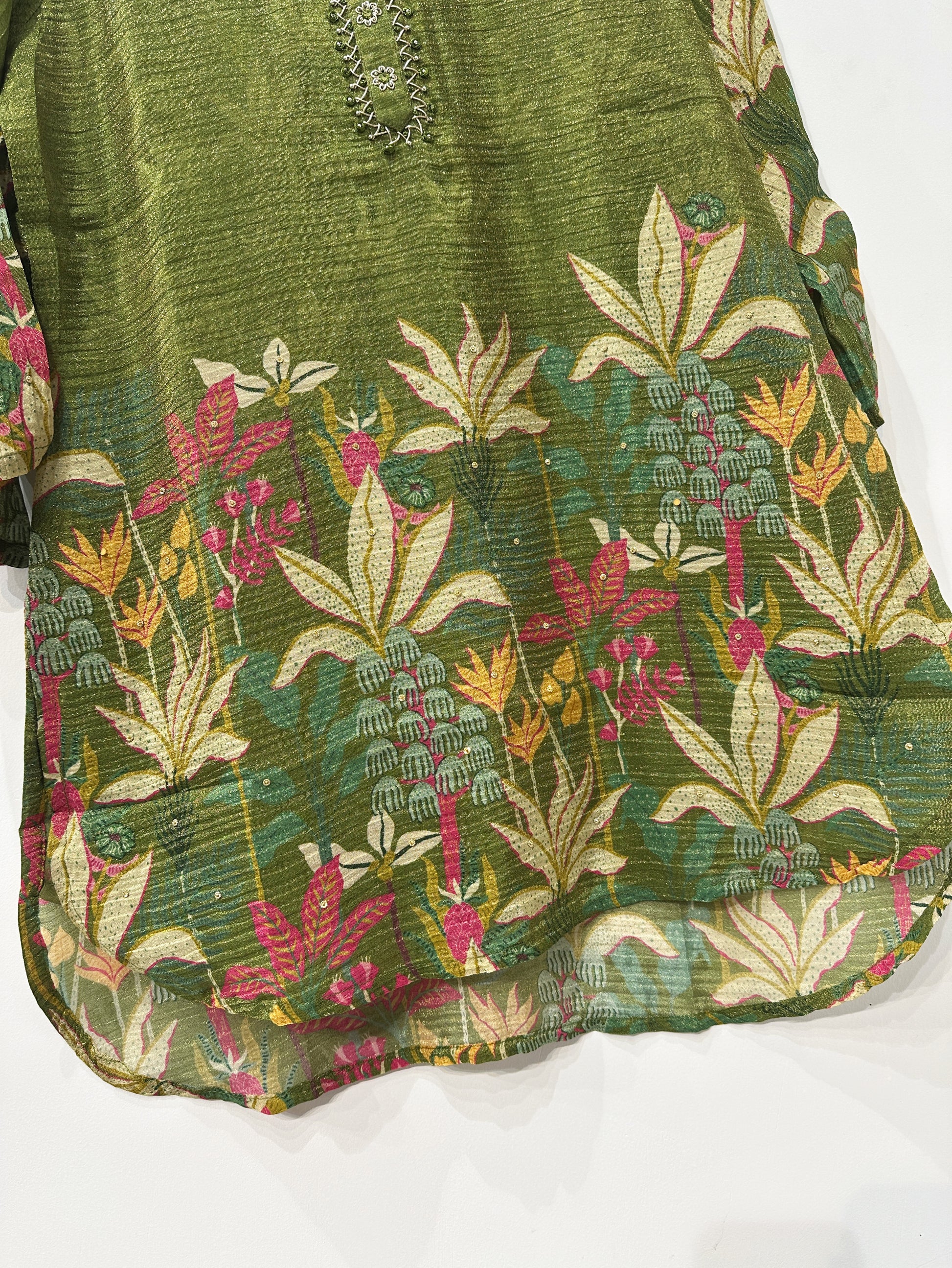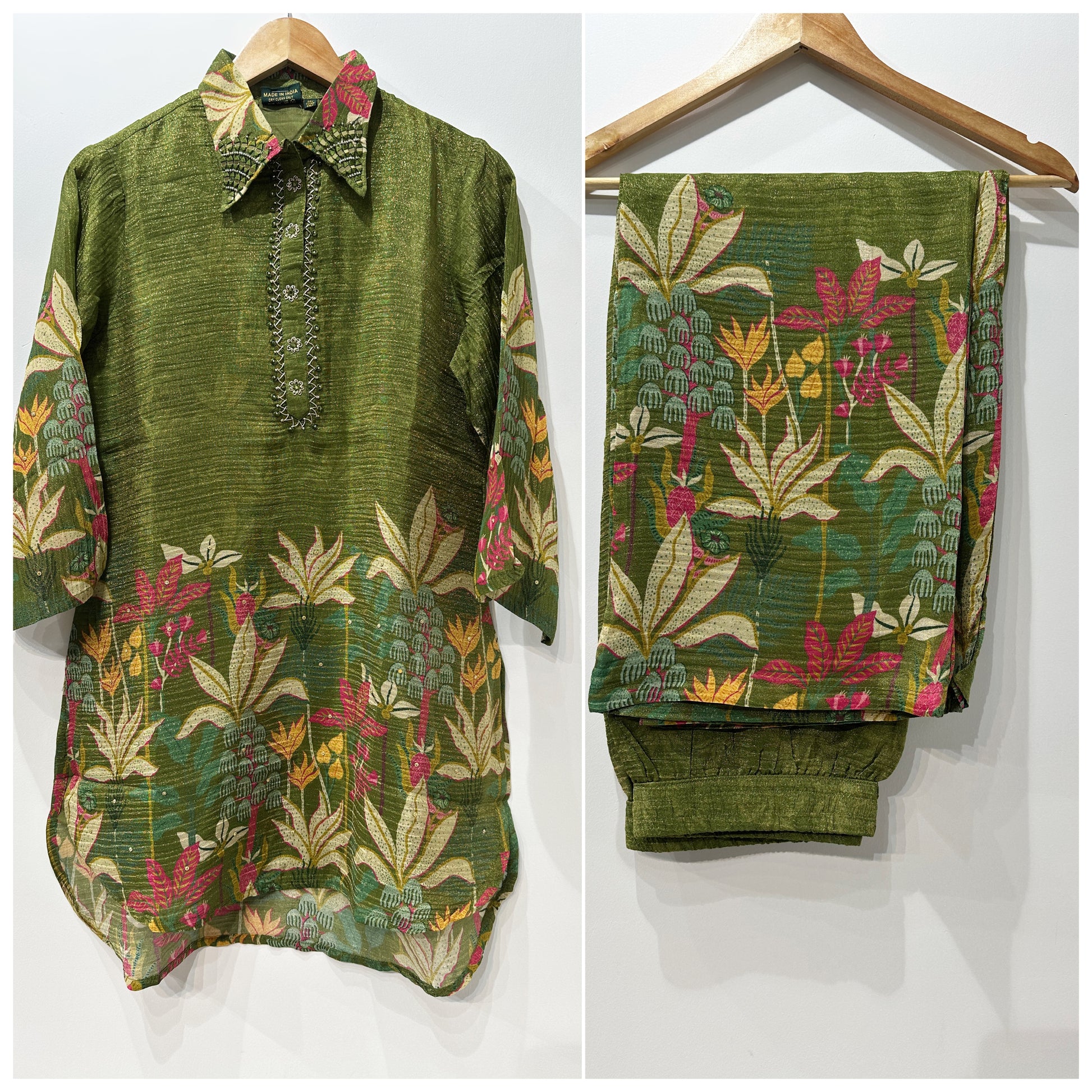 Crafted in luxurious Chinon fabric, this olive green beauty is adorned with blooming floral prints and a soft, graceful sheen. The collared kurta features delicate bead handwork, while the straight pants echo the effortless elegance of the design. Perfect for festive gatherings, brunches, or intimate celebrations — Nayab is a timeless blend of comfort and sophistication.
