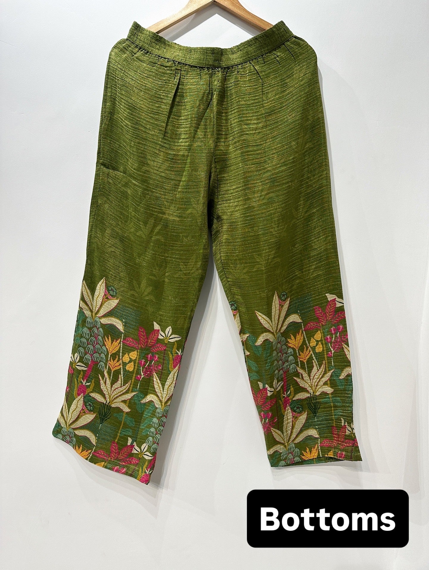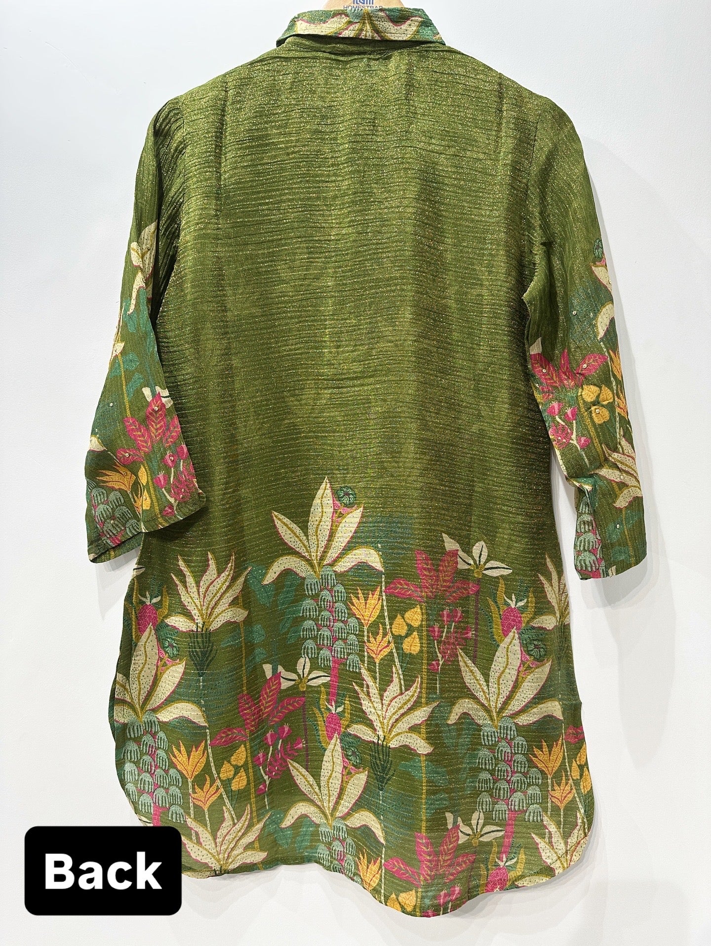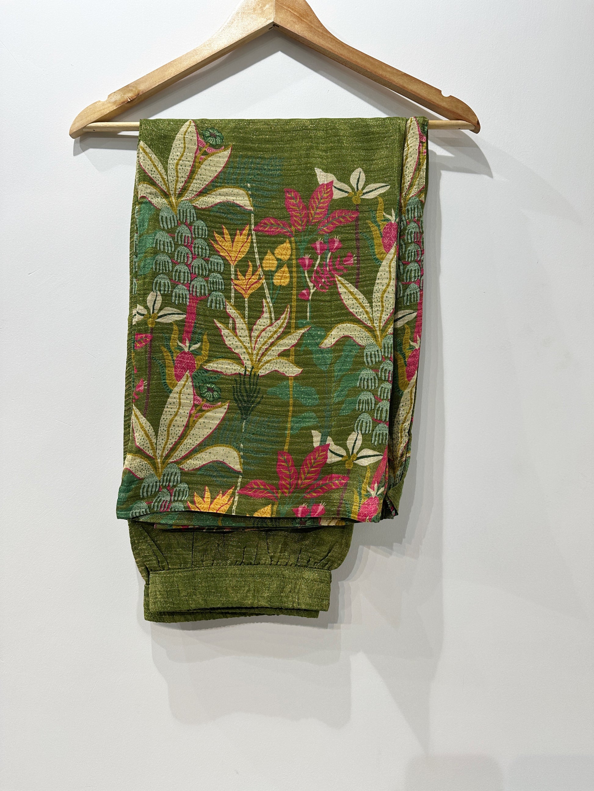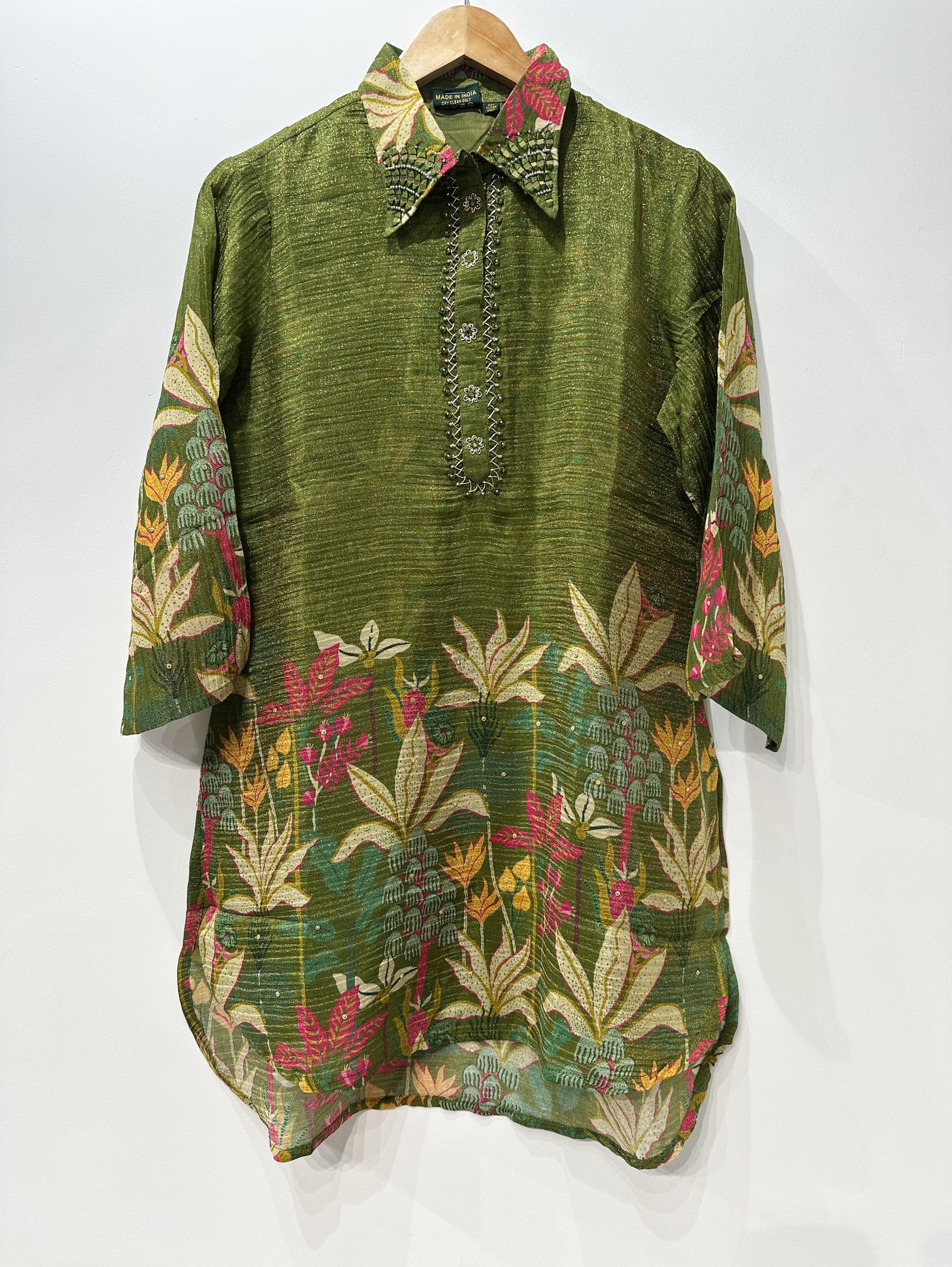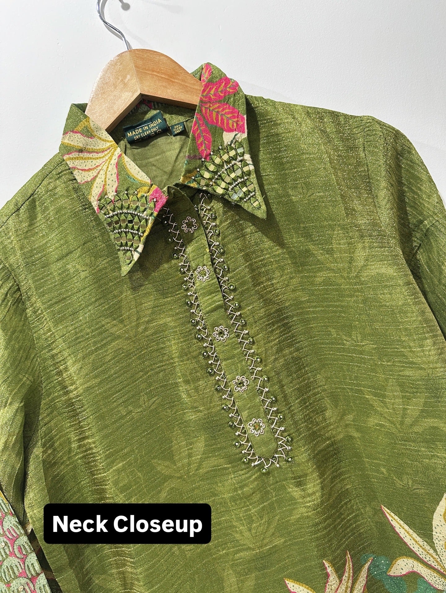 Crafted in luxurious Chinon fabric, this olive green beauty is adorned with blooming floral prints and a soft, graceful sheen. The collared kurta features delicate bead handwork, while the straight pants echo the effortless elegance of the design. Perfect for festive gatherings, brunches, or intimate celebrations — Nayab is a timeless blend of comfort and sophistication.