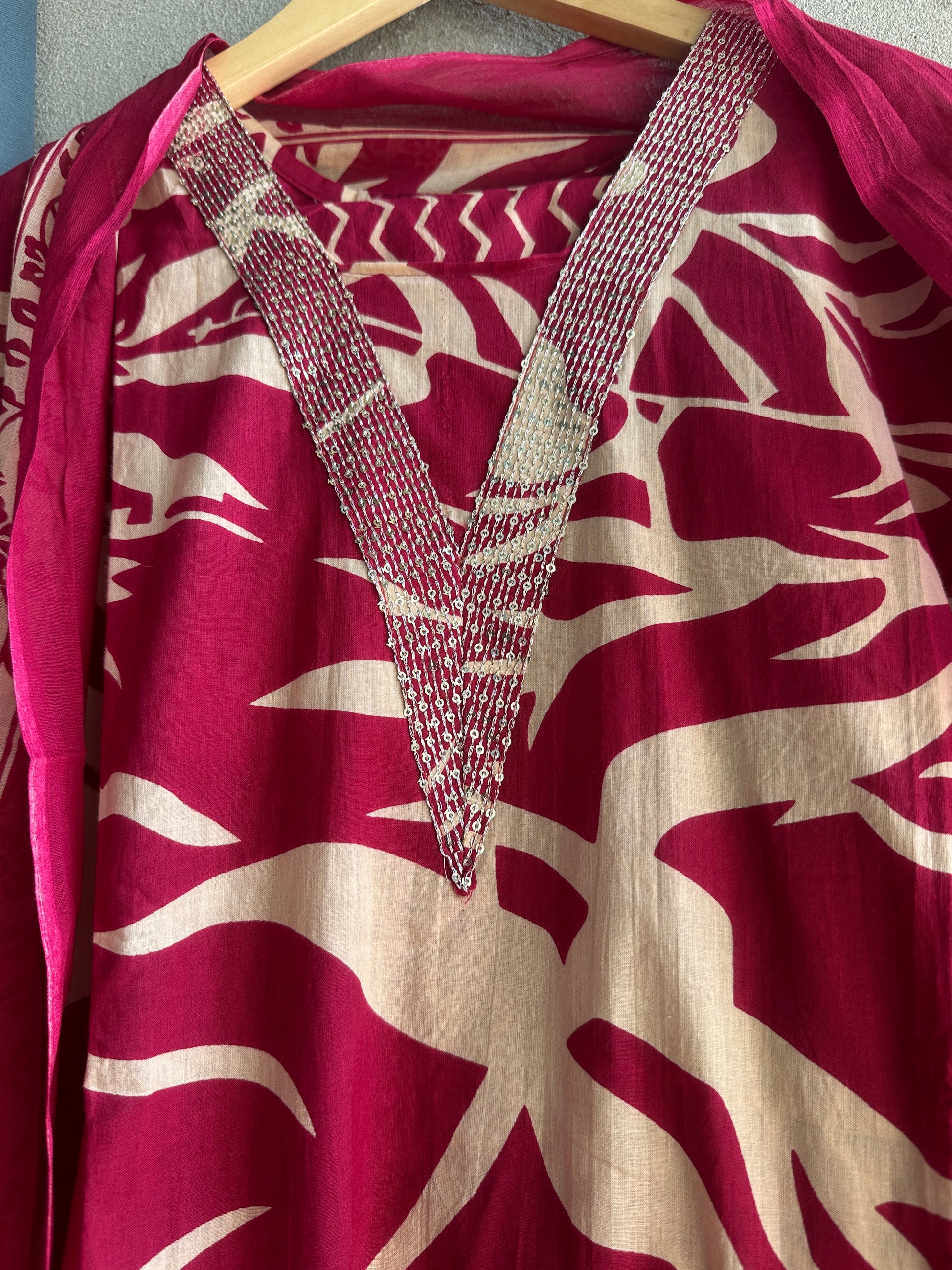 The rich crimson and beige palette features bold abstract prints, paired with a deep V-neckline enhanced with intricate sippi work that brings subtle shimmer to the ensemble. The look is completed with a matching printed straight-fit pant and an elegant cotton dupatta featuring coordinated borders.