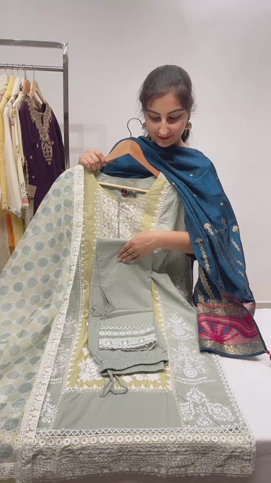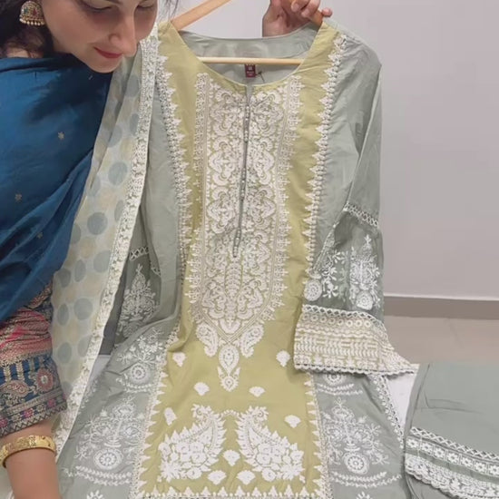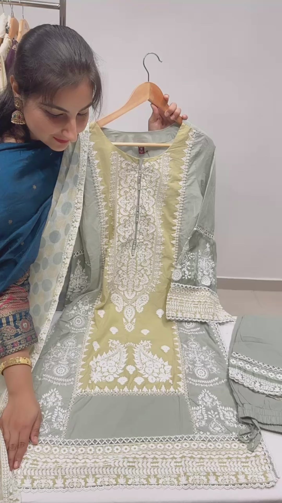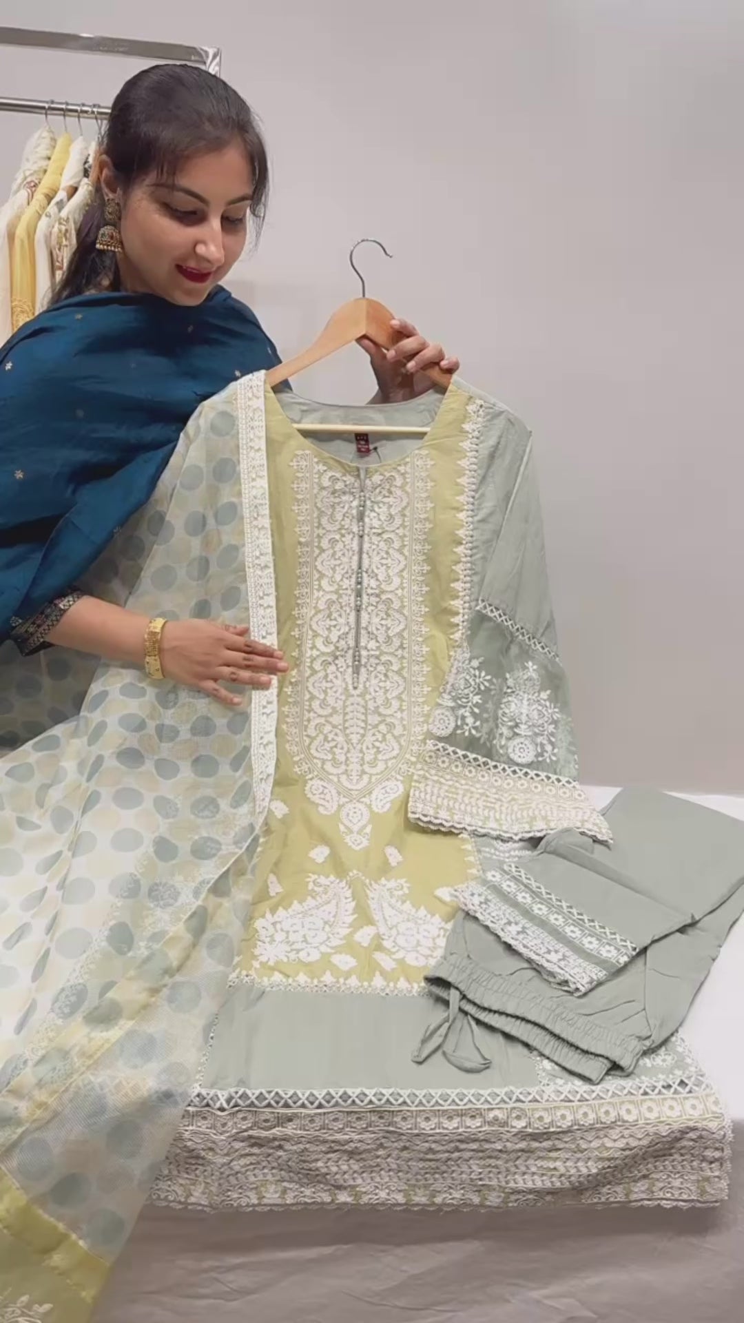 Refresh your wardrobe with this elegant pastel lime and sage green suit set. The kurta is crafted from premium cotton and features intricate white dori embroidery on the front and sleeves, paired with straight-fit cotton bottoms detailed with embroidery and lace at the hem for a coordinated look.