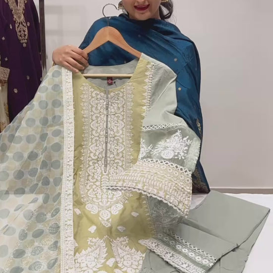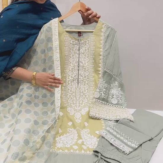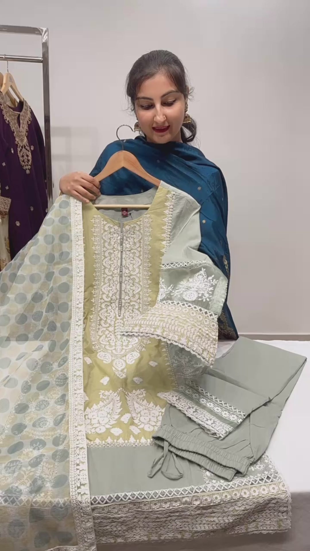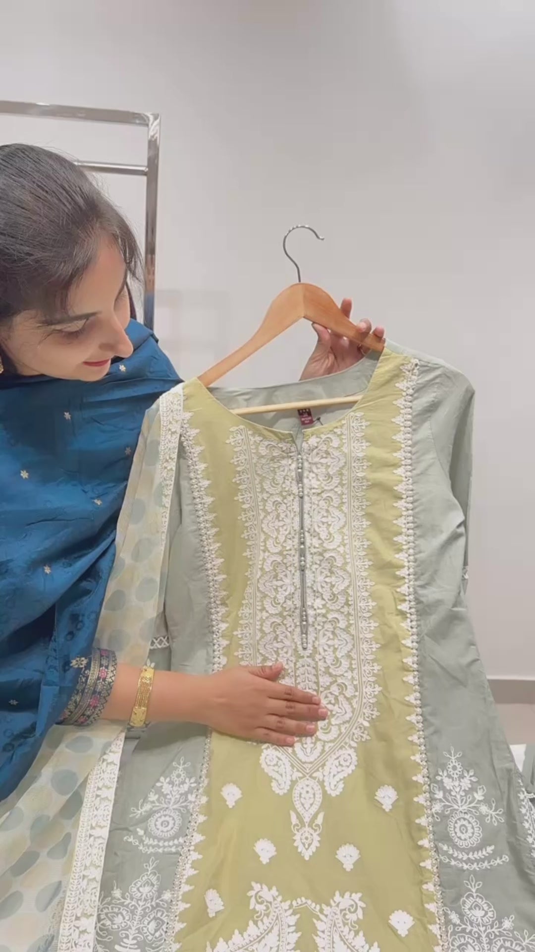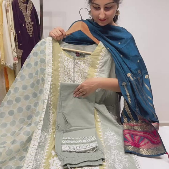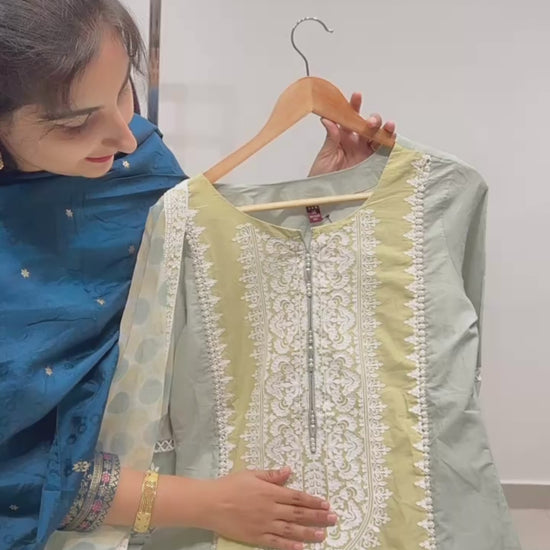 Refresh your wardrobe with this elegant pastel lime and sage green suit set. The kurta is crafted from premium cotton and features intricate white dori embroidery on the front and sleeves, paired with straight-fit cotton bottoms detailed with embroidery and lace at the hem for a coordinated look.